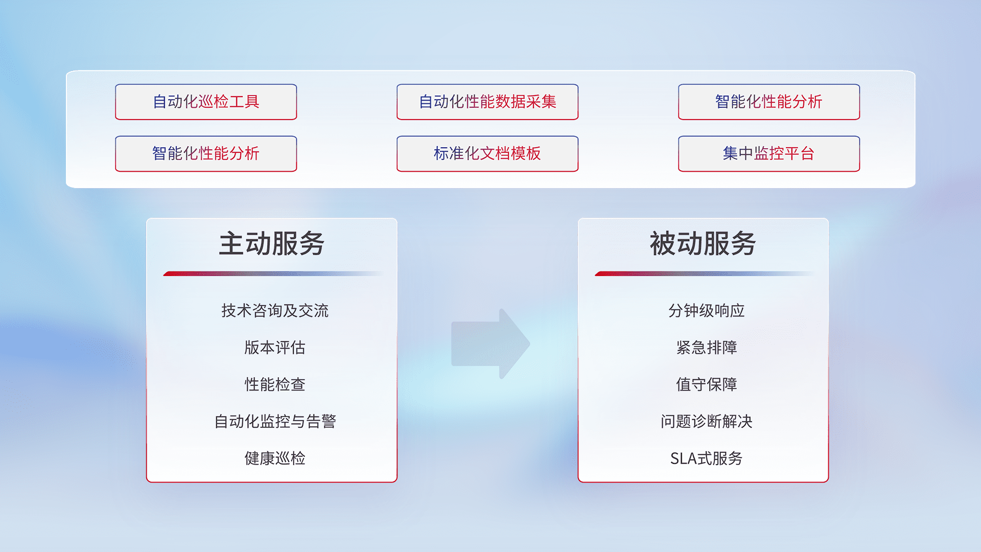 智能化工具和标准化文档,,,保障服务质量,,,提供主动服务(包含技术咨询、、、版本评估、、、、性能检查、、、、自动化监控与告警、、、健康巡检)和被动服务包含(分钟级响应、、、紧急排障、、、值守保障、、问题诊断解决、、、SLA服务)。。